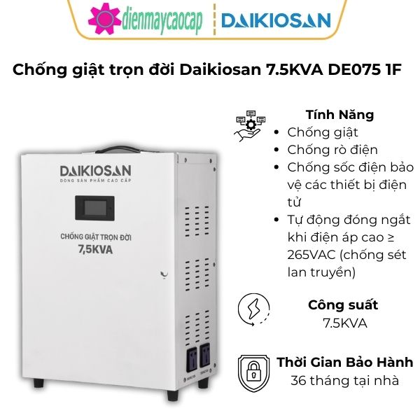 Chống giật trọn đời Daikiosan 7.5KVA DE075 1F đặc biệt phù hợp với:- Gia đình có trẻ nhỏ, người cao tuổi.