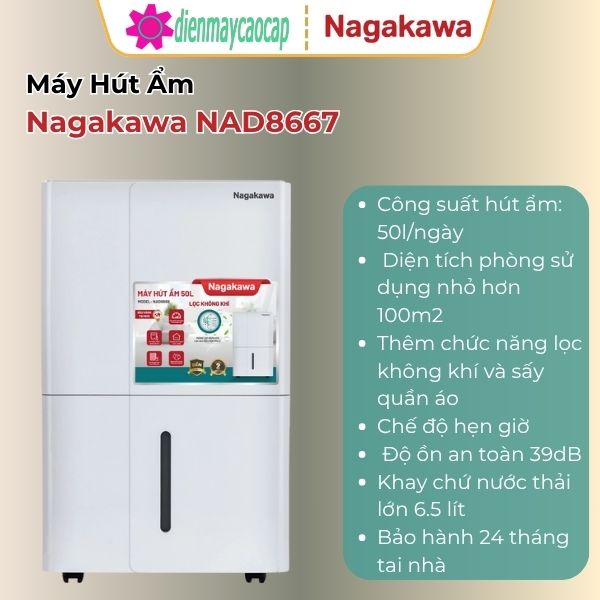 Máy hút ẩm không khí Nagakawa NAD8667 là dòng máy cao cấp được tích hợp đồng thời 3 chức năng: hút ẩm – lọc không khí – sấy quần áo. Với công suất mạnh mẽ 50 lít/ngày và thiết kế hiện đại, sản phẩm này đang được nhiều gia đình, văn phòng và cửa hàng tin dùng, đặc biệt trong mùa nồm ẩm.